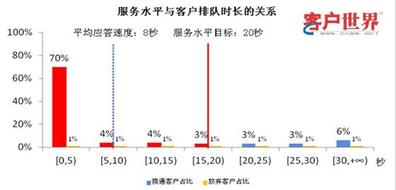 是的,還有一個(gè)原因——X秒是一個(gè)閾值,客戶在等待時(shí)長達(dá)到閾值時(shí)很可能會感到焦急不安,所以服務(wù)水平這個(gè)指標(biāo)關(guān)注的是客戶的排隊(duì)體驗(yàn)。這也是為何高端客戶服務(wù)標(biāo)準(zhǔn)中X秒的數(shù)值明顯較小,因?yàn)橥ǔ8叨丝蛻魧r(shí)間更敏感、閾值更低。