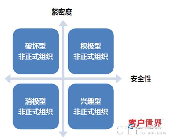 首先在非正式組織概念存在的基礎(chǔ)上,我們從安全性和緊密度兩方面來進(jìn)行非正式組織的劃分,可以將呼叫中心內(nèi)部存在的非正式組織分為四種類型: