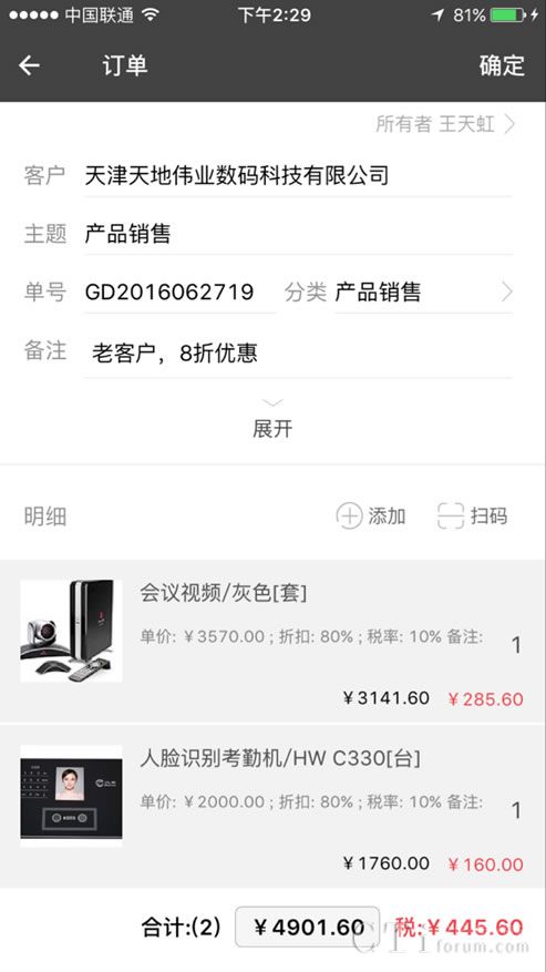 想過像淘寶一樣添加產(chǎn)品到購物車么?或者是更神奇一些,直接拿手機(jī)掃碼就可以下單了?這些都不是白日夢,我們做到了~如果您這邊是做家具銷售的,在紅星美凱龍以及各大商場里都有賣場或者是自己的直營店,各個導(dǎo)購可以直接手機(jī)下單,不用讓顧客在收銀臺前面排大隊了。我們測試新的下單方式個單可以節(jié)約至少5分鐘的時間,而且還沒有加上排隊的時間。如果您的業(yè)務(wù)是外勤人員,現(xiàn)場跟客戶聊的比較好,或者是在展會上客戶對產(chǎn)品比較感興趣,就可以快速現(xiàn)場下單了,展示一個手機(jī)截屏,可以顯示稅金和折扣的哦: