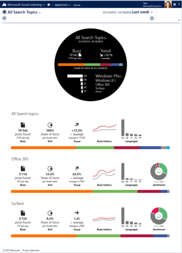 Subra正式命名為Microsoft Social Listening。它是基于微軟在2013年3月收購Netbreeze獲得的社交分析技術(shù),也被托管在Windows Azure上。Social Listening是一項附加服務(wù),可以作為配合微軟Dynamics CRM Online、CRM現(xiàn)有產(chǎn)品或者作為一款獨立服務(wù)使用。