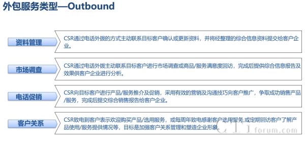 外包呼叫中心從客戶服務(wù)到市場營銷,其業(yè)務(wù)范圍幾乎包含了所有呼叫中心所能承載的業(yè)務(wù)類型。