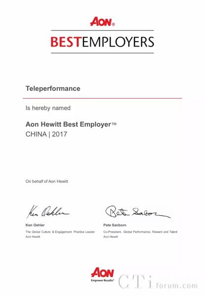 北京2017年11月--Teleperformance集團(tuán),全球知名度外包呼叫運(yùn)營(yíng)商,多渠道外包客戶管理的領(lǐng)導(dǎo)者,今天宣布了北京互聯(lián)企信信息技術(shù)有限公司(Teleperformance China)榮獲Aon Hewitt怡安翰威特評(píng)選的2017最佳雇主獎(jiǎng),這已經(jīng)是連續(xù)第四年,榮獲此項(xiàng)殊榮。怡安集團(tuán)是著名的全球人才,醫(yī)療與退休解決方案專(zhuān)家。此評(píng)獎(jiǎng)是在世界范圍內(nèi)被評(píng)測(cè)并被承認(rèn)的關(guān)于雇主卓越表現(xiàn)的獎(jiǎng)項(xiàng)。