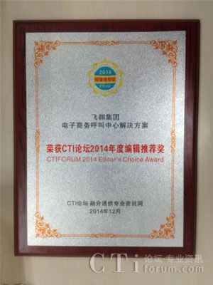2014年12月22日,由享譽(yù)國內(nèi)外的呼叫中心專業(yè)機(jī)構(gòu)CTI論壇主辦的行業(yè)應(yīng)用及市場分析主題沙龍,暨2014年度CTI論壇編輯推薦獎(jiǎng)?lì)C獎(jiǎng)典禮在北京隆重舉行。此次,@飛翱集團(tuán)榮膺2014年度編輯推薦獎(jiǎng)(呼叫中心外包解決方案)。同時(shí),飛翱集團(tuán)客戶關(guān)系營運(yùn)部的高級經(jīng)理馮莉珺女士也榮獲了2014年度編輯推薦獎(jiǎng)(最佳管理人獎(jiǎng)),并代表飛翱集團(tuán)出席了此次典禮。