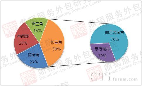 從2011年新增服務(wù)外包園區(qū)的地理位置分析,長三角地區(qū)的園區(qū)增長率獨(dú)占鰲頭,占據(jù)總數(shù)的38%,同時(shí),長三角集群的園區(qū)建設(shè)也同全國一樣呈現(xiàn)由成本較高的示范城市向成本較低的二三線非示范城市轉(zhuǎn)移的趨勢(shì)。如圖三所示,2011年長三角集群新增園區(qū)有70%分布于非示范城市,只有30%位于示范城市;而中西部地區(qū)和環(huán)渤海地區(qū)的園區(qū)發(fā)展也不甘落后,以增長23%的比例值緊隨其后;珠三角地區(qū)略遜色于其他地區(qū),增長率為15%。