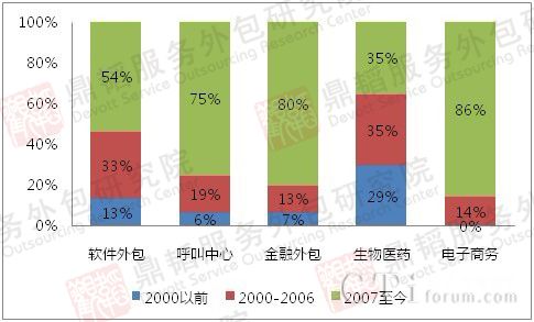 我國的服務(wù)外包產(chǎn)業(yè)于20世紀(jì)90年代中期開始萌芽,最初的服務(wù)外包形式主要是軟件業(yè)以及信息化為標(biāo)志的經(jīng)濟(jì)體系,服務(wù)外包的萌芽主要體現(xiàn)在軟件園的建設(shè)上。隨著我國服務(wù)外包產(chǎn)業(yè)的出現(xiàn)和發(fā)展,軟件園開始向外包園轉(zhuǎn)型,而且由于國家對(duì)外包業(yè)的扶持也是從軟件外包開始的,因此,外包園中發(fā)展軟件外包業(yè)務(wù)的園區(qū)占據(jù)大半;進(jìn)入2006年,我國服務(wù)外包產(chǎn)業(yè)進(jìn)入一個(gè)快速發(fā)展期,期間IT服務(wù)以及金融外包發(fā)展迅速,動(dòng)漫、生物醫(yī)藥、金融外包、呼叫中心以及創(chuàng)意文化等逐漸發(fā)展起來。作為近幾年新興產(chǎn)業(yè)中的佼佼者,電子商務(wù)、云計(jì)算產(chǎn)業(yè)等也迅速成為外包園區(qū)發(fā)展高度關(guān)注的對(duì)象。結(jié)合各業(yè)務(wù)類型的園區(qū)從成立的時(shí)間維度進(jìn)行了統(tǒng)計(jì)分析(見圖四),開展軟件外包業(yè)務(wù)的外包園區(qū)中有54%是2006年之后成立的,2000年之前成立的園區(qū)不到13%;呼叫中心業(yè)務(wù)作為重要的BPO業(yè)務(wù),從2006開始快速發(fā)展,開展呼叫中心業(yè)務(wù)的園區(qū)中有75%成立于2006年之后;開展金融外包業(yè)務(wù)的園區(qū)中,有80%的園區(qū)成立于2006年之后,由此可見,2006年千百十工程啟動(dòng)以來,金融外包產(chǎn)業(yè)成為國家和地方政府關(guān)注和扶持的重點(diǎn)外包產(chǎn)業(yè)之一,金融外包園區(qū)作為新興載體,在這一時(shí)期得到了長足發(fā)展。生物醫(yī)藥是傳統(tǒng)的垂直產(chǎn)業(yè),開展生物醫(yī)藥研發(fā)和制造的園區(qū)在每個(gè)時(shí)間段都有成立,從圖中可以看出開展生物醫(yī)藥研發(fā)外包業(yè)務(wù)的園區(qū)成立的時(shí)間也是幾乎均衡的分布在三個(gè)時(shí)間段,2000年之前29%,2006年之后35%。而開展電子商務(wù)外包業(yè)務(wù)的園區(qū)有將近90%成立于2006年之后,這是因?yàn)?007年中國電子商務(wù)進(jìn)入迅速發(fā)展的爆發(fā)期,電子商務(wù)產(chǎn)業(yè)的快速增長帶來了大量的電子商務(wù)外包業(yè)務(wù),從而催生了大量發(fā)展電商外包業(yè)務(wù)的園區(qū)。