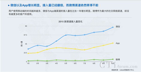 根據(jù)2015年第三季度一項(xiàng)調(diào)查數(shù)據(jù)顯示,傳統(tǒng)的呼叫中心和IM仍然是目前客戶服務(wù)的主要力量,微信、APP作為移動(dòng)端客戶服務(wù)的新渠道,無(wú)論是日均接入次數(shù)還是月接入量增長(zhǎng)趨勢(shì)對(duì)比,微信的增長(zhǎng)速度都是最快的,App緊隨其后。