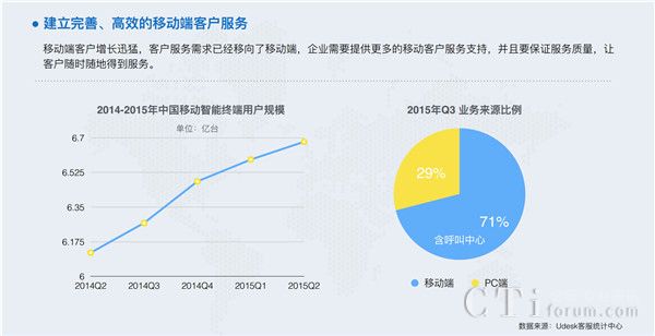 調(diào)查數(shù)據(jù)顯示,在提升客戶滿意度方式上,呼叫中心、im、微信等渠道可以有效的減少用戶等待時(shí)間,客服完成業(yè)務(wù)的時(shí)間較短,工作效率相對(duì)較高。另外,隨著移動(dòng)端的發(fā)展智能終端用戶急速增長(zhǎng),企業(yè)71%業(yè)務(wù)來(lái)自移動(dòng)端,客戶的需求已經(jīng)轉(zhuǎn)向移動(dòng)端。企業(yè)應(yīng)需要加速建立完善、高效的移動(dòng)端客戶服務(wù)。