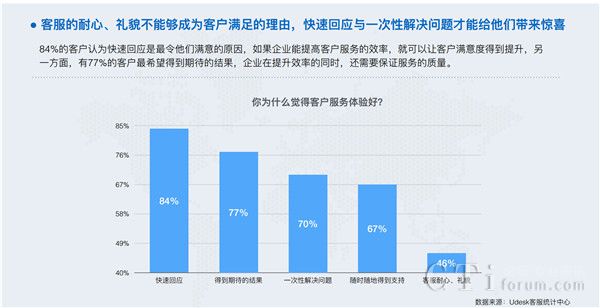 在客戶服務(wù)中,客服人員的禮貌不足已成為讓用戶滿意的理由。快速反應(yīng)、一次性解決問(wèn)題才能讓用戶覺(jué)得驚喜和滿意。在調(diào)查中,84%的用戶表示快速回應(yīng)會(huì)讓他們感到滿意。