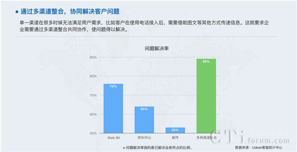 移動(dòng)端微信、APP和社交平臺(tái)的發(fā)展,導(dǎo)致單一渠道在很多時(shí)候無(wú)法滿足用戶的需要 ,比如用戶需要借助圖文等其他方式傳遞信息時(shí),如果只有單一的web IM渠道或者呼叫中心渠道,就很難做到了。為滿足客戶隨時(shí)隨地的個(gè)性化需求,越來(lái)越多的企業(yè)開(kāi)始通過(guò)多渠道整合來(lái)提供客戶服務(wù)。根據(jù)數(shù)據(jù)對(duì)比分析得出,多渠道整合的問(wèn)題解決率高達(dá)80%,遠(yuǎn)遠(yuǎn)高于其他單一渠道的問(wèn)題解決率。