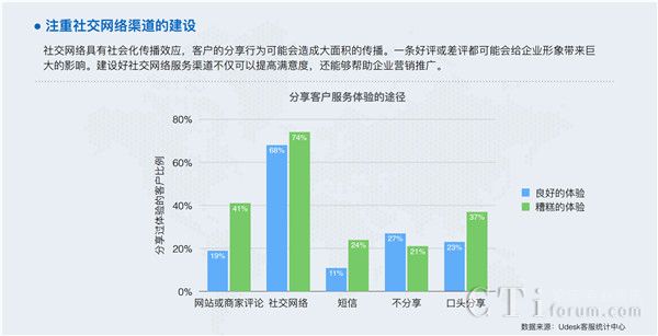 隨著社交平臺(tái)的發(fā)展,越來(lái)越多的客戶會(huì)將自己的購(gòu)物體驗(yàn)分享出去,因?yàn)樯鐣?huì)化傳播效應(yīng)的影響,企業(yè)也越來(lái)越關(guān)注這方面的客戶服務(wù)。根據(jù)調(diào)查結(jié)果,客戶經(jīng)常用到的幾個(gè)分享體驗(yàn)途徑(如社網(wǎng)站或是商家評(píng)論、社交平臺(tái)、口頭分享等)中社交網(wǎng)絡(luò)平臺(tái)客戶使用率最高,達(dá)到了74%。
