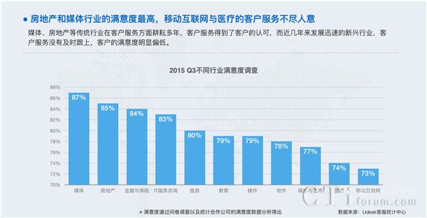 來(lái)自于不同行業(yè)的滿意度調(diào)查數(shù)據(jù)顯示,2015年媒體和房地產(chǎn)行業(yè)的滿意度最高,達(dá)到了87%以上。而近期發(fā)展勢(shì)頭驚人的移動(dòng)互聯(lián)網(wǎng)卻只有73%。其他行業(yè)維持在75%~80%之間。