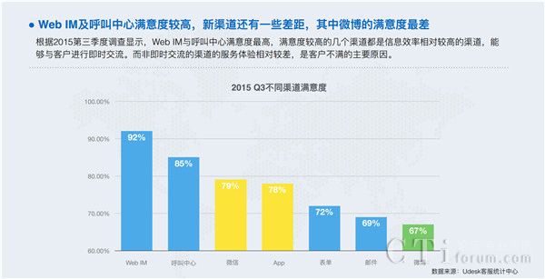 在與客服滿意度緊密相連的客服渠道方面,調(diào)查研究數(shù)據(jù)顯示,Web IM和呼叫中心滿意度分別達(dá)到了92%和85%。而傳統(tǒng)郵件和微博由于反饋周期過(guò)長(zhǎng)等原因滿意率不到70%。