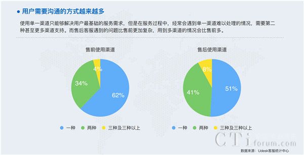 另外,互聯(lián)網(wǎng)的發(fā)展,導(dǎo)致用戶溝通方式逐漸增多,企業(yè)也從傳統(tǒng)的單一渠道逐漸向多渠道發(fā)展。特別是在售后服務(wù)方面,有數(shù)據(jù)顯示,由于售后服務(wù)的復(fù)雜和多樣性,對(duì)兩種甚至是三種以上的渠道需求明顯增加。但由于基礎(chǔ)性服務(wù)的特點(diǎn),售前服務(wù)卻仍然以單一渠道為主。