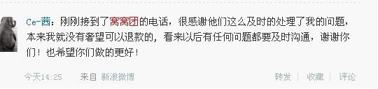 窩窩團的服務受到了用戶發(fā)自內(nèi)心的表揚,很多網(wǎng)民朋友通過微博這種新型的媒體發(fā)布自己對窩窩團服務的滿意和感謝之情。其中,有相當一部分內(nèi)容是針對窩窩團的不滿意就退款服務的。