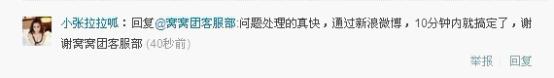 在新浪微博上,一個名叫窩窩團客服部的ID常常及時熱情的回復網(wǎng)民的各種問題,它也受到了廣大用戶的喜愛,網(wǎng)民紛紛和她進行互動,進行親切的交流。在窩窩團真心服務的道路上,在窩窩和用戶良好溝通的氛圍里,窩窩團的服務已經(jīng)開始深入用戶的心中。