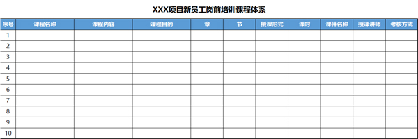 2. 由培訓部門牽頭、運營團隊配合,根據(jù)上述培訓內(nèi)容編制新員工崗前培訓課程體系,參考用表《XXX項目新員工崗前培訓課程體系》見下,并開發(fā)完成全套新員工崗前培訓課件(所有培訓課件須經(jīng)過評審方能正式投入使用)。