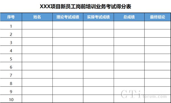 ?、?span > 新員工培訓考核所需用表,可參考《XXX項目新員工崗前培訓業(yè)務(wù)考試得分表》(見下)。
