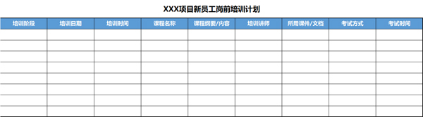 3. 每班次開始培訓前,由培訓部門制定包括:培訓階段、培訓日期、培訓時間、課程名稱、課程綱要/概述、培訓講師、所用課件/文檔,以及考試時間安排等內(nèi)容在內(nèi)的新員工崗前培訓計劃,參考用表《XXX項目新員工崗前培訓計劃》見下。其中:第一階段的培訓是指理論知識的講解式培訓,第二階段的培訓是指實操式的培訓(即實操訓練)。