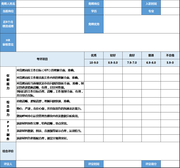 2. 《XXX公司/項(xiàng)目?jī)?nèi)部競(jìng)聘評(píng)審表》