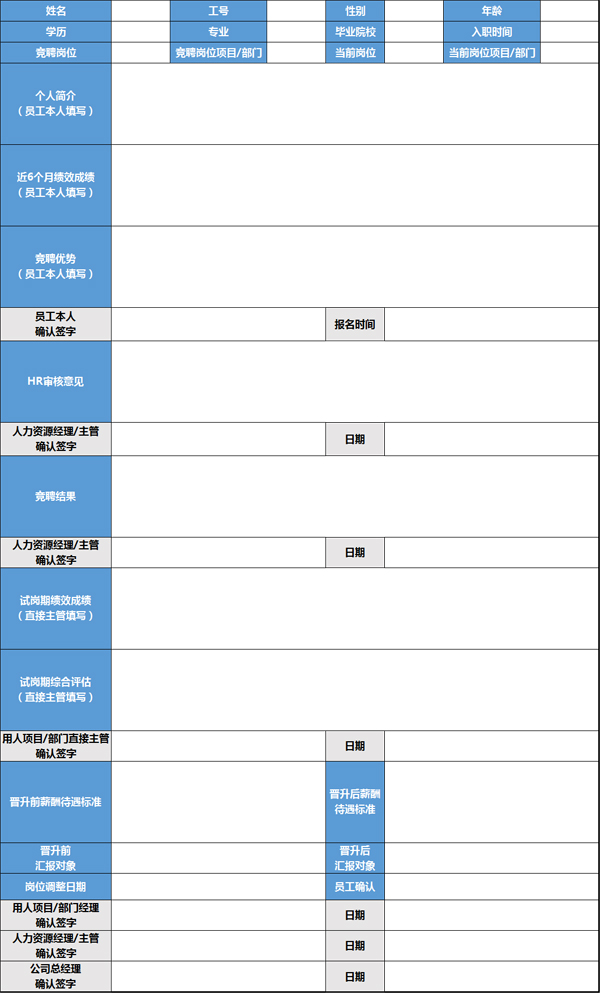 12. 對(duì)于通過(guò)試崗期評(píng)估者,由HR部門(mén)或項(xiàng)目人事行政主管/專(zhuān)員負(fù)責(zé),填制《XXX公司/項(xiàng)目?jī)?nèi)部競(jìng)聘報(bào)名表》中的晉升前后相關(guān)信息及崗位正式調(diào)整日期,并跟進(jìn)完成審批環(huán)節(jié)。