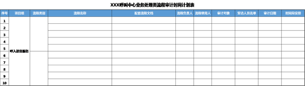 由流程管理專員或SV(運營主管)作為流程審計人員,按照《XXX呼叫中心流程審計時間計劃表》中的具體安排,采用調研訪談或在工作現(xiàn)場實地觀摩的方式,完成對所有流程的審計環(huán)節(jié)。
