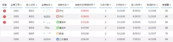 如下圖所示:工號(hào)1001、1002、1003示忙狀態(tài)均超過8分鐘(含)以上,可隨即找到員工了解原因并做出針對(duì)性的改進(jìn)方案: