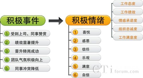 積極心理學(xué)研究當(dāng)中,特別提到工作場(chǎng)所中有利于工作目標(biāo)實(shí)現(xiàn)的事件和條件構(gòu)成了積極的情緒事件正是這些積極事件導(dǎo)致了積極情緒的產(chǎn)生,而積極情緒將會(huì)讓個(gè)體產(chǎn)生更持久的態(tài)度,如工作滿意度、情感承諾度、組織忠誠(chéng)度等管理指標(biāo)。
