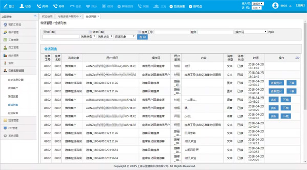 云翌為先聲診斷上線云呼叫中心系統(tǒng),開(kāi)通在線客服功能。通過(guò)在先聲診斷網(wǎng)頁(yè)代碼中嵌入在線客服JS代碼,實(shí)現(xiàn)用戶在先聲診斷網(wǎng)頁(yè)中與云呼叫中心座席進(jìn)行在線溝通。系統(tǒng)隨機(jī)分配咨詢客戶給座席人員,座席可查看或回復(fù)圖片及文字。除了網(wǎng)頁(yè)客服,云翌為先聲診斷開(kāi)通的在線客服功能還包括微信客服。先聲診斷微信公眾平臺(tái)調(diào)用云呼叫中心消息通知接口,把文字或圖片、語(yǔ)音內(nèi)容轉(zhuǎn)發(fā)至空閑座席客服。無(wú)論是網(wǎng)頁(yè)客服還是微信客服,都可以設(shè)置歡迎詞及自動(dòng)回復(fù),提高企業(yè)形象;點(diǎn)擊最新聯(lián)系的在線咨詢,都可以看到過(guò)往的聊天記錄,方便更快捷更有效的為客戶服務(wù)。