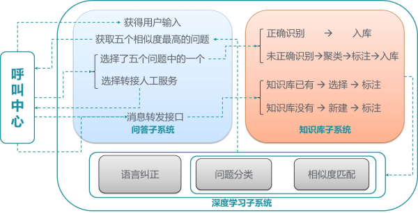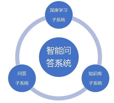 智能問(wèn)答系統(tǒng)由以下三個(gè)核心子系統(tǒng)組成,分別為問(wèn)答子系統(tǒng)、知識(shí)庫(kù)子系統(tǒng)、深度學(xué)習(xí)子系統(tǒng)。由三個(gè)子系統(tǒng)共同配合實(shí)現(xiàn)智能機(jī)器人服務(wù)。