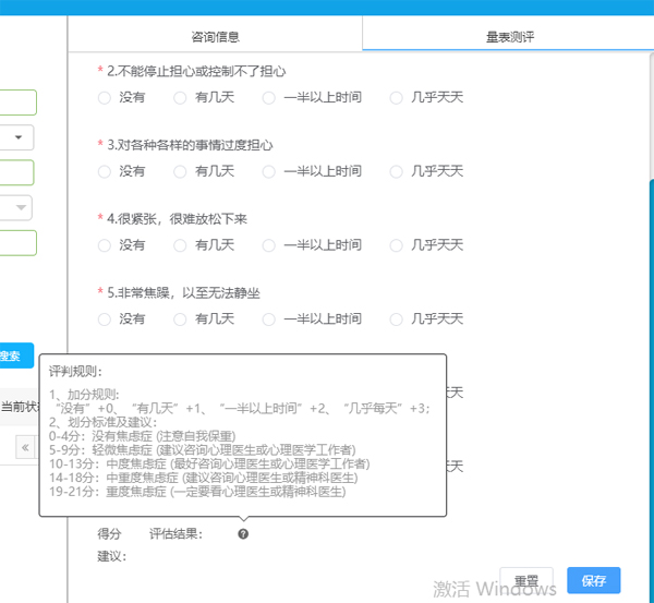通過干預(yù)數(shù)據(jù)評(píng)估模塊,可以幫助咨詢員對(duì)求助者的心理狀態(tài)(如情緒狀態(tài)、自殺意念、是否高危等)進(jìn)行科學(xué)評(píng)估。咨詢員通過自動(dòng)評(píng)判量表分?jǐn)?shù),得出求助者的心理健康評(píng)估等級(jí),并按照等級(jí)提示對(duì)患者進(jìn)行相應(yīng)的心理干預(yù)及處理方案。