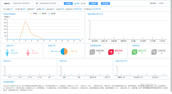 通過大屏數(shù)據(jù)分析展示,監(jiān)管員可更清晰地掌握系統(tǒng)當(dāng)前運(yùn)營(yíng)狀態(tài),大屏展示數(shù)據(jù)包含來(lái)電量、咨詢問題分類TOP8、來(lái)電地區(qū)、抑郁高危、特殊來(lái)電、求助者信息分類、熱線接聽情況匯總分析等。