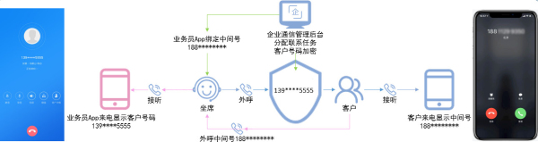 在業(yè)務(wù)員與客戶生成臨時中間號碼,完全隱藏雙方真實電話號碼,保護(hù)各方隱私,實現(xiàn)客戶信息與業(yè)務(wù)員想信息間的雙加密。