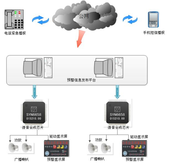 - 縣機(jī)房配置有自帶文本轉(zhuǎn)語(yǔ)音功能的縣級(jí)智能編碼控制器以及縣級(jí)智能調(diào)頻調(diào)制器各一臺(tái)、尋址終端管理平臺(tái)軟件一套。該語(yǔ)音播報(bào)功能采用語(yǔ)音合成芯片SYN6658實(shí)時(shí)預(yù)警播報(bào),該TTS芯片體積小,支持GB2312、GBK、BIG5、UNICODE四種內(nèi)碼格式的文本,并有多種特效提示音和專業(yè)語(yǔ)音提示音,聲音甜美,自然度高,抗噪音能力強(qiáng),是一款適于各種智能報(bào)警預(yù)警系統(tǒng)的TTS芯片。