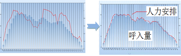 3) 班組的小顆粒?;谑止び?jì)算的能力以及班組建設(shè)的要求,很多客服中心采用了組排班,通常一個組的人數(shù)大致從10-20不等。這樣大的顆粒導(dǎo)致在同一時間要么安排一個完整的小組,要么完全不安排,對話務(wù)擬合非常不利。而如果采用規(guī)模更小的組(例5人),或者按人進(jìn)行排班,則會得到更好的話務(wù)擬合。