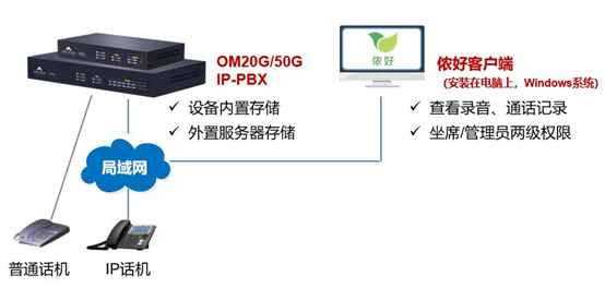 - 經(jīng)濟(jì)實(shí)用:無需另外購買錄音卡、錄音盒、錄音話機(jī),只需一臺(tái)OM系列IP電話交換機(jī)(IP-PBX)就能輕松實(shí)現(xiàn)全程錄音。錄音文件既可存儲(chǔ)在OM系列IP電話交換機(jī)的內(nèi)置U盤里(支持循環(huán)使用),也可存儲(chǔ)在公司服務(wù)器上(支持長時(shí)間存儲(chǔ))。
