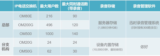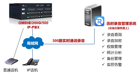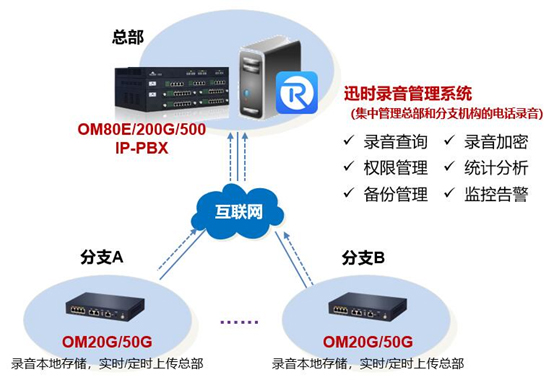 - 分布式錄音,集中式管理:分支機(jī)構(gòu)部署OM系列小型IP電話交換機(jī)(IP-PBX),電話錄音內(nèi)置存儲(chǔ);總部部署OM系列大中型IP電話交換機(jī)和迅時(shí)錄音管理系統(tǒng),統(tǒng)一管理總部和各分支機(jī)構(gòu)的電話錄音。