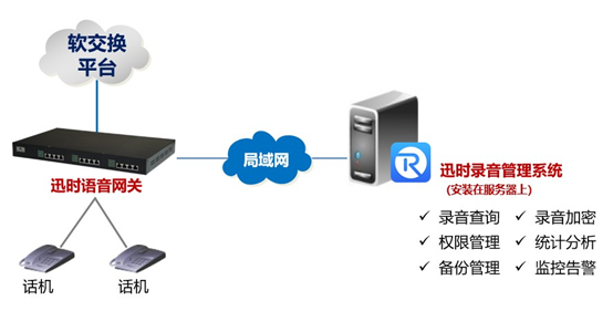 4、保留原有軟交換平臺(tái),用迅時(shí)語音網(wǎng)關(guān)實(shí)現(xiàn)電話錄音