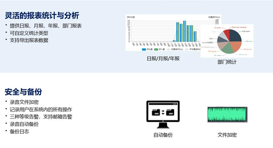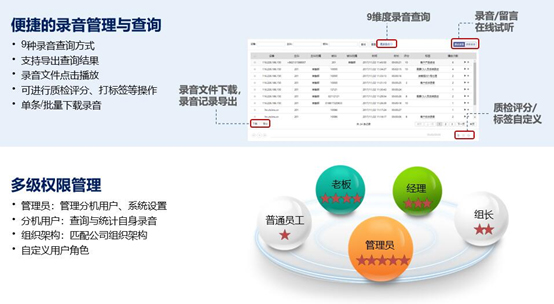 - 專業(yè)管理:支持錄音查詢、多級(jí)權(quán)限管理、統(tǒng)計(jì)分析、錄音加密、自動(dòng)備份等功能。