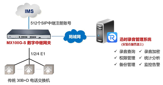 迅時(shí)數(shù)字中繼網(wǎng)關(guān)提供1/2/4個(gè)E1接口和512個(gè)SIP中繼賬號(hào)注冊,幫助企業(yè)原有30B+D設(shè)備接入運(yùn)營商IMS平臺(tái)。所有經(jīng)過迅時(shí)數(shù)字中繼網(wǎng)關(guān)的通話直接生成錄音,并將錄音文件存儲(chǔ)在服務(wù)器上,通過迅時(shí)錄音管理系統(tǒng)對錄音進(jìn)行集中管理。