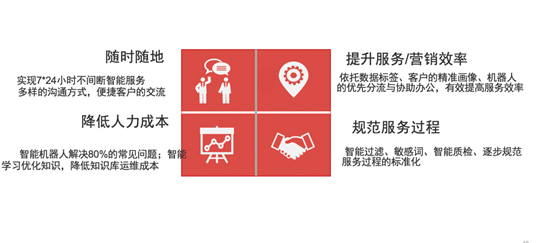 2. 提升服務/營銷效率:依托數(shù)據(jù)標簽,客戶的精準畫像,機器人的優(yōu)先分流與協(xié)助辦公,有效提高服務效率。