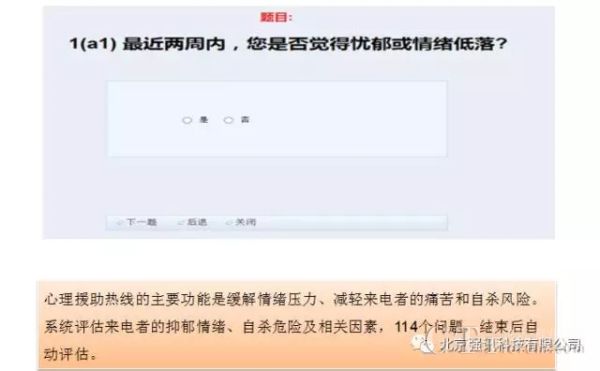 心理咨詢熱線系統(tǒng)的抑郁情緒及自殺危險評估,均按國家相關篩查標準制定的問卷的114個問題用例,保證評估結果科學準確。抑郁評估結果分為:無抑郁情緒、輕度抑郁情緒和重度抑郁情緒。自殺危險程度由低到高分為7級。同時,按0~100分的方式評估來電者的希望程度、痛苦程度及想死的程度。