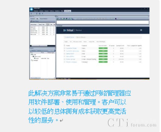 MiContact Center Enterprise 是一款一體化的靈活、自適應(yīng)的綜合平臺(tái),集成了統(tǒng)一通信、移動(dòng)通信、聯(lián)絡(luò)中心、業(yè)務(wù)流程自動(dòng)化、分析與報(bào)告,以及服務(wù)與數(shù)據(jù)庫(kù)等功能。敏迪公司致力于為客戶(hù)提 供一個(gè)真實(shí)、雙向、多模式互動(dòng)的聯(lián)絡(luò)中心平臺(tái),甚至可以為您提供額外的全媒體接入功能,包括增 強(qiáng)的電子郵件和即時(shí)聊天選擇。這個(gè)平臺(tái)將完全取代傳統(tǒng)僅支持語(yǔ)音的電話(huà)聯(lián)系中心。MiContact Center Enterprise 目前更可以支持多軟交換平臺(tái)上的硬電話(huà)作為座席。