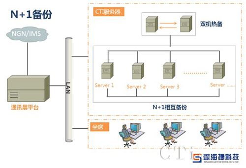 a、系統(tǒng)采用相互冗余備份(N+1備份),負(fù)荷分擔(dān)的組網(wǎng)方式。其運(yùn)行特點(diǎn)是,任何一臺(tái)CTI服務(wù)器出現(xiàn)故障時(shí),系統(tǒng)的單點(diǎn)故障并不會(huì)影響其他組件運(yùn)行,從而保障整套系統(tǒng)的通信從接入層、數(shù)據(jù)交互層到終端通話都始終暢通。