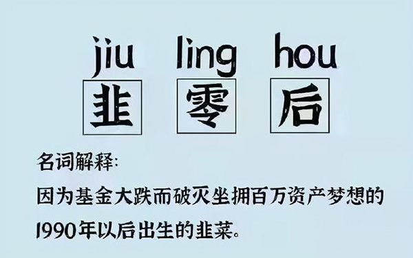 公開(kāi)資料顯示,“韭零后”是90后的諧音,在網(wǎng)絡(luò)用語(yǔ)中泛指1990年以后出生的,購(gòu)買基金后暴跌的一群人。