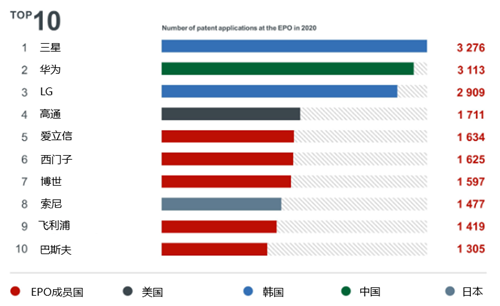 2020年Top10申請人排名,也反映了中國和韓國專利申請的持續(xù)增長。三星(3276件)位居榜首,其次是華為(3113件),LG位居第三(2909件)。