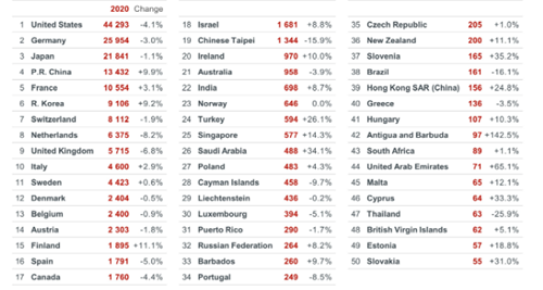 從發(fā)明的來源地區(qū)來看,2020年排名前五位的國家是美國(44293件)、德國(25954件)、日本(21841件)、中國(13432件)和法國(10554件),但增長率有較大差異:前10名國家中增長最強(qiáng)勁的是中國(+9.9%)和韓國(+9.2%),與2019年保持一致。
