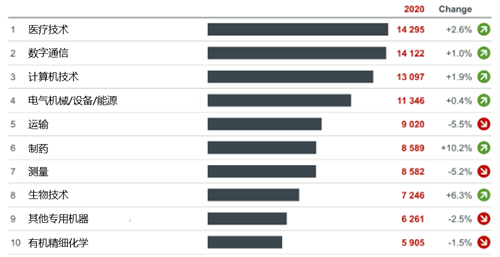 在領(lǐng)先的技術(shù)領(lǐng)域中,藥品(+10.2%)和生物技術(shù)(+6.3%)的專利申請量增幅最大。2020年,醫(yī)療技術(shù)(+2.6%)是發(fā)明數(shù)量最多的領(lǐng)域,超過了2019年最活躍的數(shù)字通信領(lǐng)域。