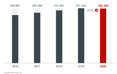 2020年,歐洲專利局(EPO)共受理專利申請180250件,受COVID-19疫情影響,較2019年(181532件)下降了0.7%。