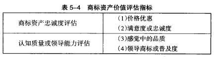 由美國著名的商標專家大衛(wèi)?艾格( David aaker)教授1996年提出(詳見 Measuring Brand equity Across Products andMarkets),從五個方面衡量商標資產(chǎn)忠誠度、認知質(zhì)量或領(lǐng)導能力、商標聯(lián)想或差異化、商標認知與市場行為,并提出了這五個方面的10項具體評估指標,如表5-4所示。