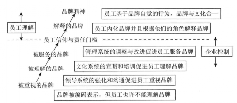 De Chematony( 2006)認(rèn)為雖然基于員工(包括管理者和普通員工)的品牌內(nèi)化與基于組織的品牌內(nèi)化分別有不同的重點(diǎn),但彼此并非割裂的,而是品牌內(nèi)化過程的兩個階段。為此,他把品牌內(nèi)化過程劃分為企業(yè)的控制階段和員工的理解階段,如圖9-2所示。在企業(yè)的控制階段,品牌內(nèi)化工作基于組織的層面,我們認(rèn)為企業(yè)要進(jìn)行領(lǐng)導(dǎo)系統(tǒng)的強(qiáng)化與溝通、文化系統(tǒng)的宣貫與培訓(xùn)和管理系統(tǒng)的調(diào)整與改進(jìn),企業(yè)內(nèi)各個部門都要提供相應(yīng)的協(xié)作與支持,在這一階段品牌需要被編碼,成為員工重視、理解和服務(wù)的形式;而在員工的理解階段,品牌內(nèi)化工作基于員工的層面,他們在消化吸收企業(yè)的品牌內(nèi)涵與價(jià)值的同時要將其與自身的工作緊密聯(lián)系起來,使品牌與行為達(dá)成一致。